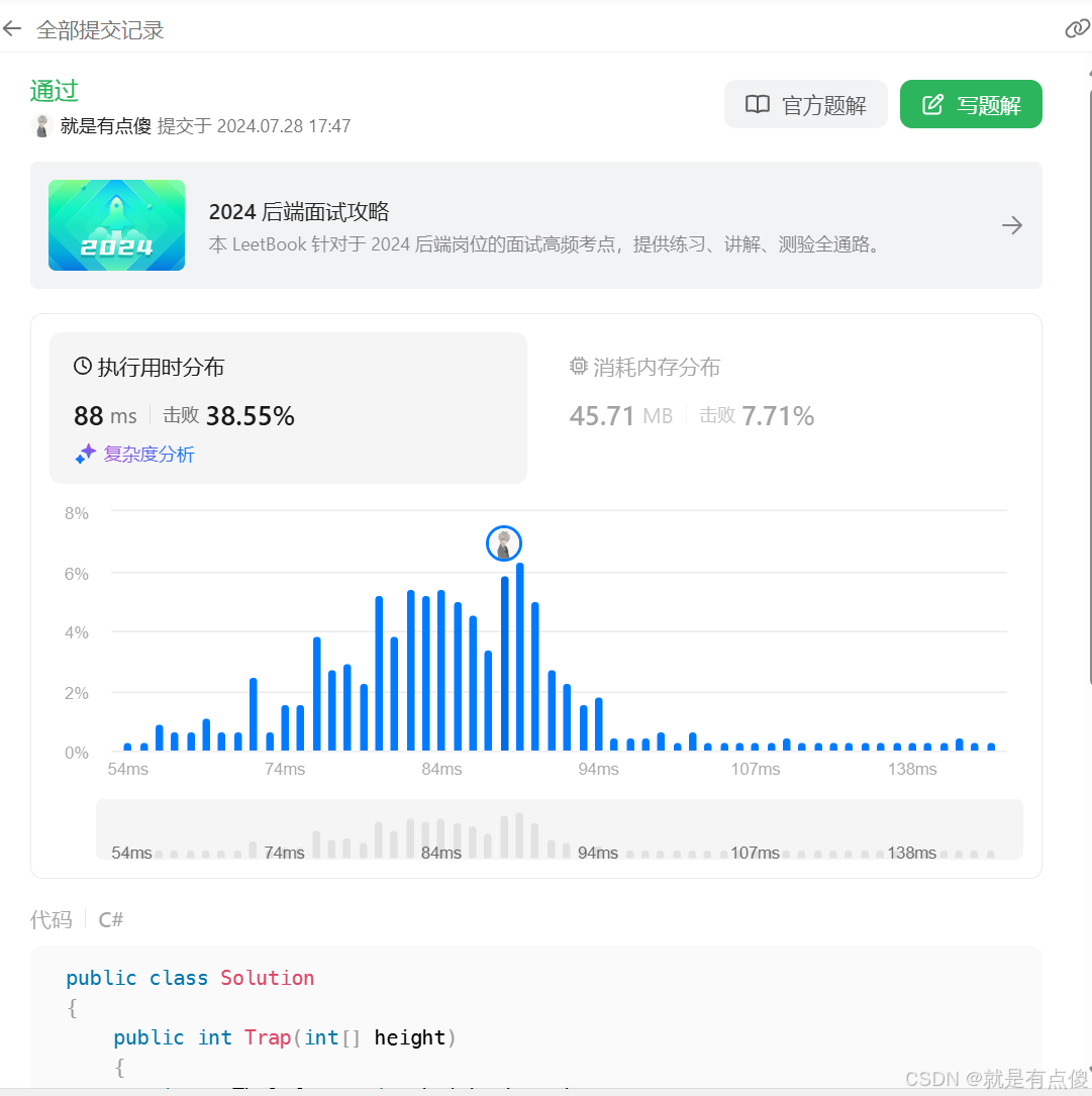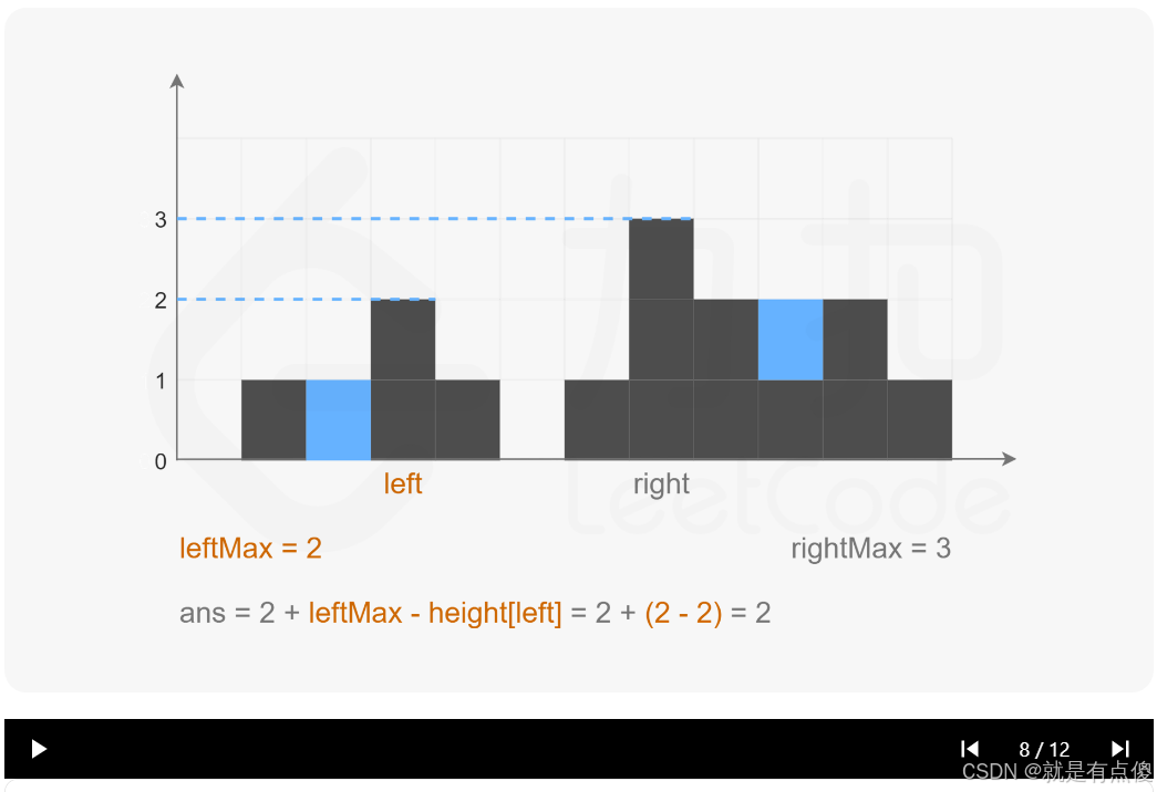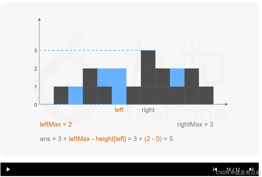 创建两个长度为 n 的数组 leftMax 和 rightMax。对于 0≤i 显然,leftMax[0]=height[0],rightMax[n−1]=height[n−1]。两个数组的其余元素的计算如下: 当 1≤i≤n−1 时,leftMax[i]=max(leftMax[i−1],height[i]); 当 0≤i≤n−2 时,rightMax[i]=max(rightMax[i+1],height[i])。 因此可以正向遍历数组 height 得到数组 leftMax 的每个元素值,反向遍历数组 height 得到数组 rightMax 的每个元素值。 在得到数组 leftMax 和 rightMax 的每个元素值之后,对于 0≤i 但是官方的双指针更优化 方法三:双指针 注意到下标 i 处能接的雨水量由 leftMax[i] 和 rightMax[i] 中的最小值决定。由于数组 leftMax 是从左往右计算,数组 rightMax 是从右往左计算,因此可以使用双指针和两个变量代替两个数组。 维护两个指针 left 和 right,以及两个变量 leftMax 和 rightMax,初始时 left=0,right=n−1,leftMax=0,rightMax=0。指针 left 只会向右移动,指针 right 只会向左移动,在移动指针的过程中维护两个变量 leftMax 和 rightMax 的值。 当两个指针没有相遇时,进行如下操作: 使用 height[left] 和 height[right] 的值更新 leftMax 和 rightMax 的值; 如果 height[left] 如果 height[left]≥height[right],则必有 leftMax≥rightMax,下标 right 处能接的雨水量等于 rightMax−height[right],将下标 right 处能接的雨水量加到能接的雨水总量,然后将 right 减 1(即向左移动一位)。 当两个指针相遇时,即可得到能接的雨水总量。 下面用一个例子 height=[0,1,0,2,1,0,1,3,2,1,2,1] 来帮助读者理解双指针的做法。 动态规划(Dynamic Programming,简称DP)是一种在数学、管理科学、计算机科学、经济学和生物信息学等领域中使用的,通过把原问题分解为相对简单的子问题的方式求解复杂问题的方法。 动态规划经常用于求解具有重叠子问题和最优子结构性质的问题。这里的“重叠子问题”是指在递归算法中反复出现的问题,而“最优子结构”是指问题的最优解包含其子问题的最优解。 识别子问题:将问题分解为小的子问题,这些子问题往往是原问题的规模较小的版本。 确定状态:定义问题的解状态,通常用变量表示,例如 确定状态转移方程:找出状态之间的关系,即当前状态是如何由之前的一个或多个状态推导出来的。 确定初始状态和边界条件:确定状态转移的起点,即基本情况或边界条件。 确定求解策略:是自底向上(从最小的子问题开始解决)还是自顶向下(递归地解决)。 构造最优解:根据子问题的解构造原问题的解。 示例:斐波那契数列的动态规划解法 斐波那契数列是一个典型的动态规划问题,其递归解法存在大量重复计算。动态规划解法如下: 动态规划是一种非常强大的方法,可以显著提高算法的效率,特别是在解决具有重复子问题和最优子结构的问题时。