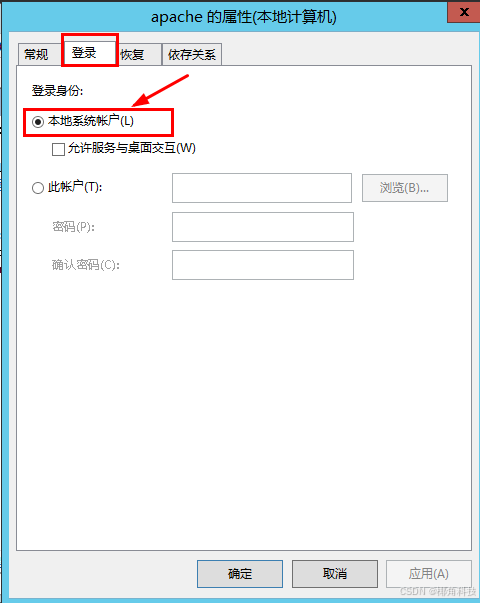 点击登录选项卡,登录身份选择:本地系统账户,然后确定。