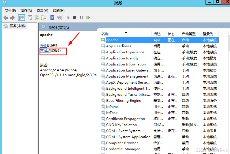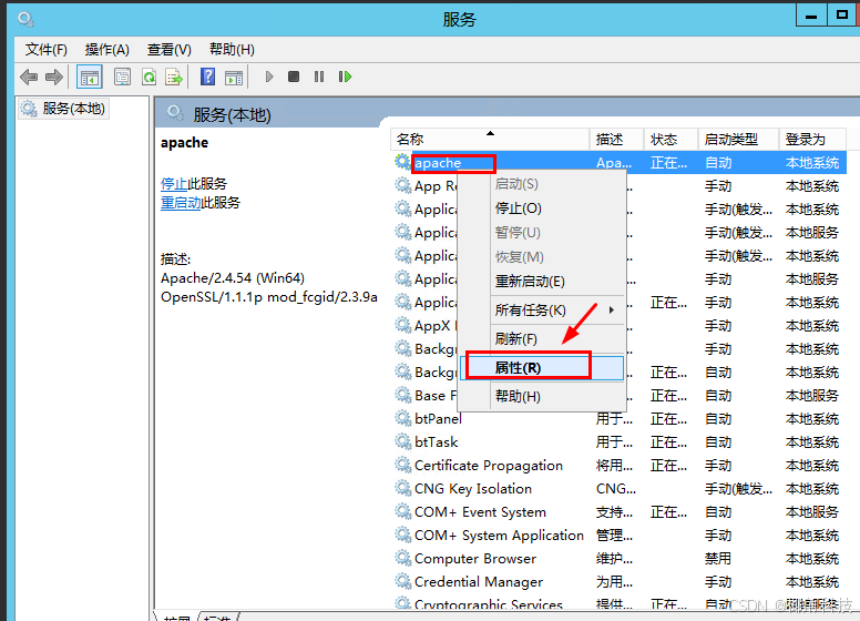 进入服务器,打开本地服务,找到停止运行的apache,右键属性。