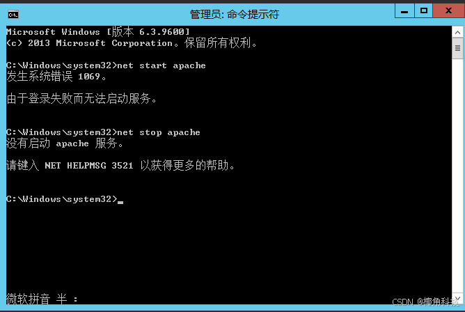 Windows Server 2012 R2服务器突然停止运行apche,启动apache失败,提示请通过cmd命令行启动:net start apache