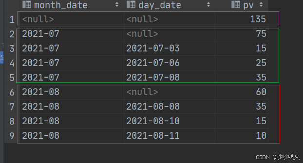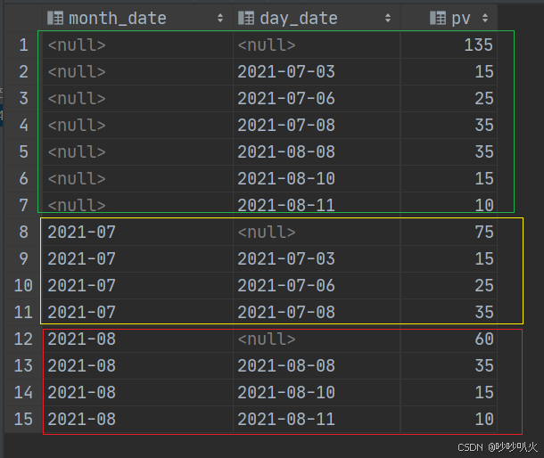 with test1 as (select '2021-08' as month_date,'2021-08-11' as day_date,10 as pv union all select '2021-08' as month_date,'2021-08-10' as day_date,15 as pv union all select '2021-08' as month_date,'2021-08-08' as day_date,35 as pv union all select '2021-07' as month_date,'2021-07-08' as day_date,35 as pv union all select '2021-07' as month_date,'2021-07-06' as day_date,25 as pv union all select '2021-07' as month_date,'2021-07-03' as day_date,15 as pv) select month_date, day_date, sum(pv) as pv from test1 group by month_date,day_date grouping sets ( (), (month_date), (month_date,day_date), (day_date) ) order by month_date,day_date;