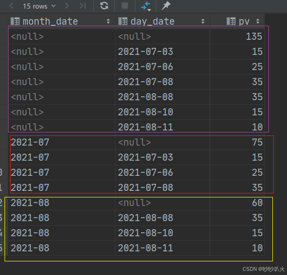 从结果上可以看出,with rollup 和with cube的区别是,少了day_date这个单独维度的聚合,因为with rollup是以左侧维度为主,当左侧month_date维度为NULL时,右侧day_date维度必须为NULL。