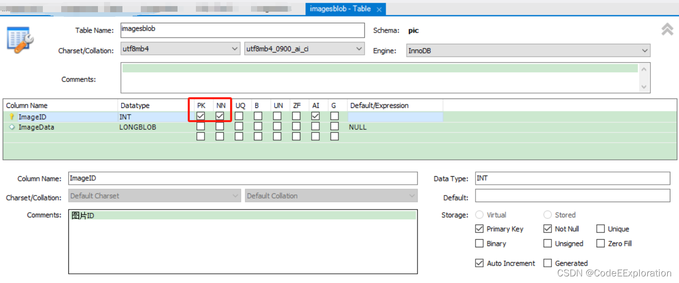 因为后面存图片时显示:Error Code: 1406. Data too long for column 'ImageData' at row 1 0.000 sec,表示“ImageData”列的数据太长,于是我换成了LONGBLOB类型