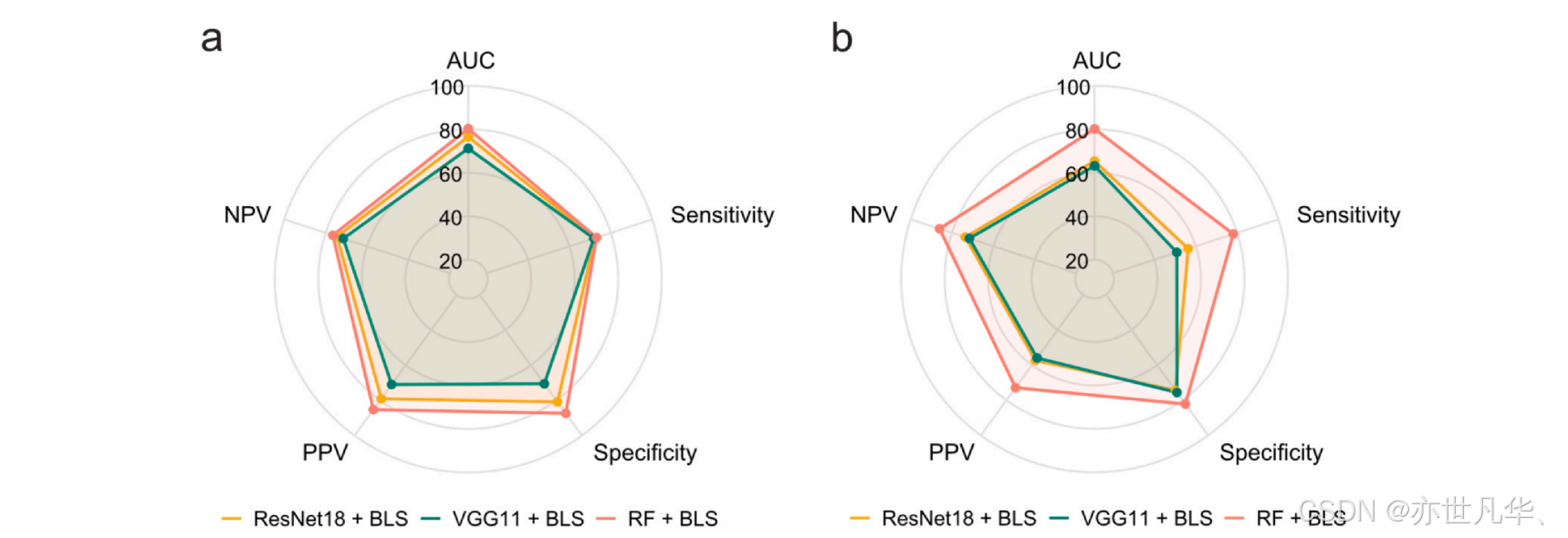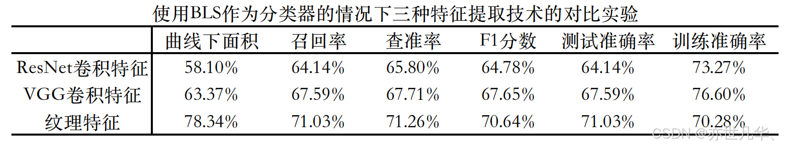 如图所示,我们按照论文步骤,将三种不同类型的特征分别输入到BLS分类器中进行性能的对比实验,可以得到与论文中一致的结果。在到达相似的训练程度时,输入纹理特征的模型相比其他两种特征模型能够在各项指标上取得更好的结果。特别是在医疗领域最为关注的曲线下面积(AUC)这一项中,该模型拉开了比较大的差距。因此我们可以推测出,在基于纹理特征(RF)的BLS模型与基于深度卷积特征(DF)的BLS模型的对比中,前者的结果更容易解释。这是因为RF与BMD高度相关,使得理解输入特征与输出结果之间的关系更加直观。尽管DF可以捕捉高级语义信息,在某些数据类型中可能更有利,但在这个特定任务中,基于RF的BLS模型的分类性能优于基于DF的BLS模型,表明RF在此任务中更为适用。
