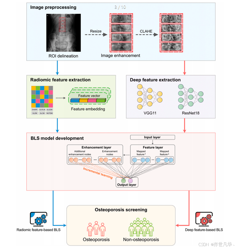 宽度学习系统(BLS)的一个显著优点是其简洁的平面结构,这使得特征表示和数据分类变得简单。与其他具有复杂架构的机器学习算法不同,BLS的设计简洁,便于特征表示的学习和数据分类。这种结构也使得模型能在大数据集上高效运行,而不需要大量的计算资源。BLS模型的另一个优点是其权重是通过解析计算确定的,从而降低了过拟合的风险。对于基于纹理特征(RF)的BLS模型,它产生的结果比基于深度卷积特征(DF)的BLS模型更容易解释。这是因为RF与BMD高度相关,这使得理解输入特征与输出之间的关系变得更容易,例如,DF可以解释高级语义信息,这对某些类型的数据可能是有益的。但是,在这种情况下,基于BSF的模型的性能会比基于任务的RF更好,RLS的性能会更好。