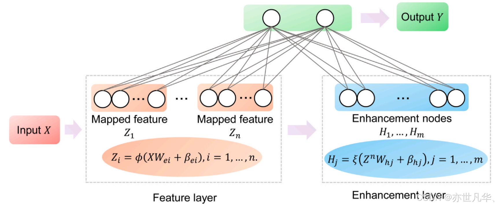 BLS基于随机向量功能连接神经网络和伪逆理论设计,使其能够快速、增量地学习,并且无需重新训练即可重构系统。BLS模型(如图所示)由输入层、特征和增强节点复合层以及输出层组成。在复合层中,使用不同组的随机权重从输入数据生成多个映射特征组,形成特征节点。此外,特征节点被增强为增强节点,每个增强节点使用不同的随机权重生成。输出是通过所有连接到输出层的特征节点和增强节点计算得出的,BLS的一个显著优势是训练和输出结果所需的时间非常少。由于采用伪逆理论,输出层的权重可以通过简单的矩阵运算与上一层的数据进行快速计算和更新。RF和DF被用作BLS模型的输入,用于图像分类。