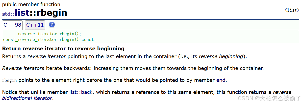 2.rbegin(end)与rend(begin)为反向迭代器,对迭代器执行++操作,迭代器向前移动。
