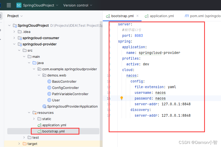 在 /resource 文件夹下创建 bootstrap.yml 文件,和原先的 application.yml 配置文件平级,并将原先配置文件中的 nacos 配置的部分移动到优先级更高的文件 bootstrap.yml 里。