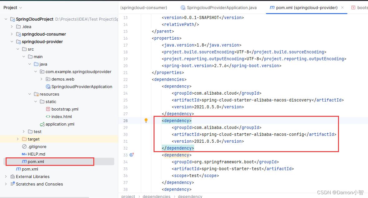 这次,由于我们需要使用到 Nacos 配置管理的功能,所以每个服务模块的 pom.xml 里还需要引入用于 Nacos 配置管理的 jar 包: