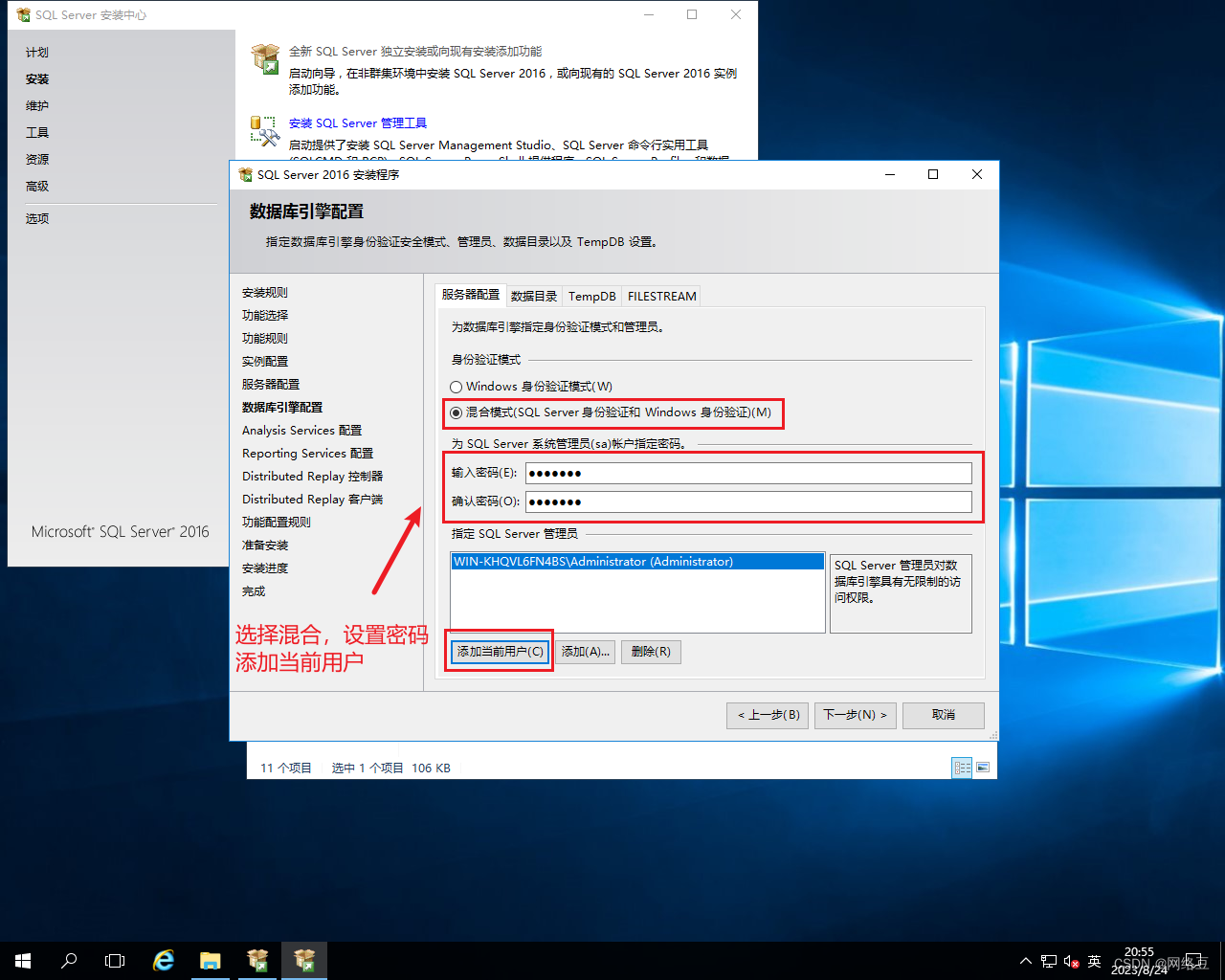 5.身份验证:SQL Server使用Windows操作系统中的信息验证用户名和密码; 混合模式:使用SQL Server身份验证(sa)和Windows 身份验证)