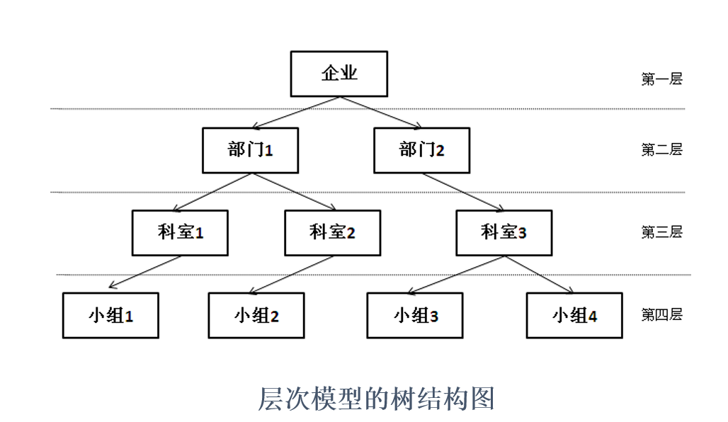 层次模型是一种树状结构的数据模型,它是数据库系统最早使用的一种模型。在一个层次模型中,数据以树状的方式相互连接,每个数据元素都可以与其他多个数据元素直接关联 。一对多