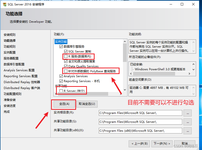 4.在“功能选择”界面,根据实际需求现在要安装的功能,选中功能然后单击下一步即可