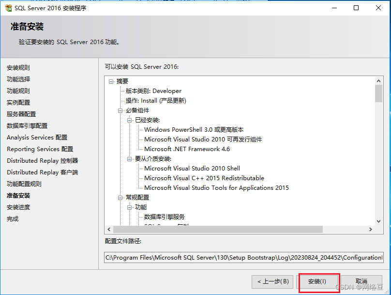 6.在“准备安装”界面中,可以看到“摘要”信息,然后单击“安装”开始安装