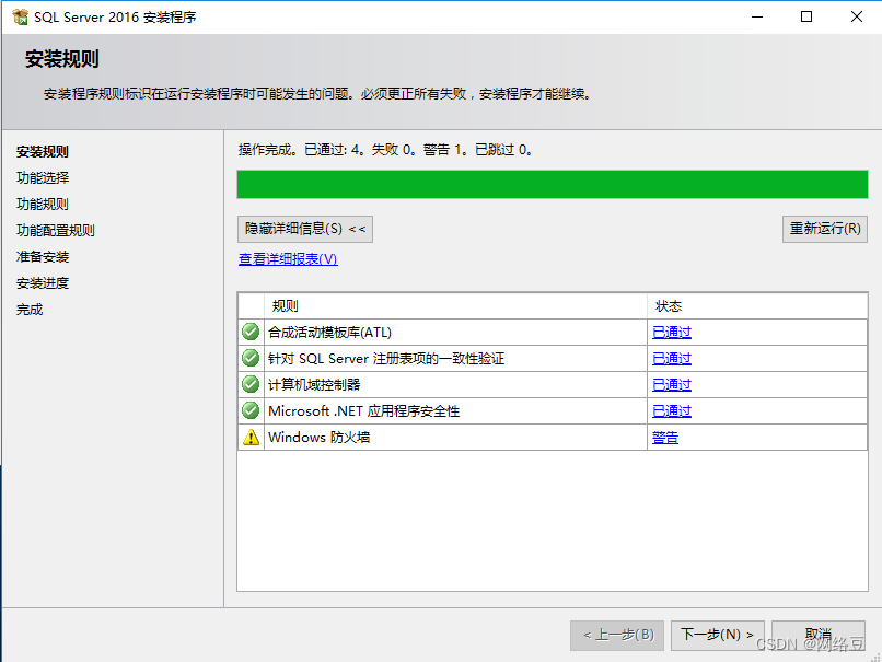 3.各个规则状态为“已通过”或“警告”,表示可以继续进行安装,单击“下一步”。(如果存在问题,需要查看检查报告内容,根据提示解决问题)