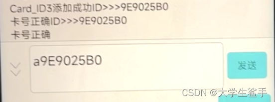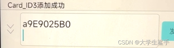 添加此ic卡用户信息至信息库中, 输入a9E902580换行点击发送, 如果修改成功, 系统会通过蓝牙返回添加成功和添加至第几个ic卡位。添加后, 再次用校园卡放到RC522模块上, 就可以解锁,