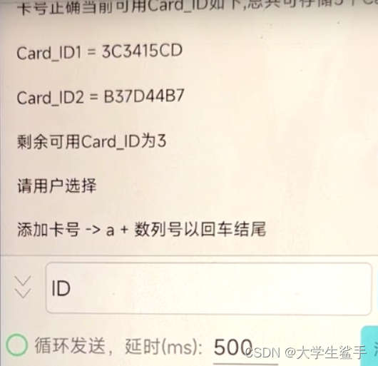 会显示当前存储的卡片数据, 显示剩余可用ID数, 目前可用ID数为3,用户可以选择a+卡号就是我上面的那个3c34一大串, 加回车换行发送,就可以添加新的卡解锁喽, 我知道有人会想我不知道我买的这个模块送的卡片的卡号啊? 所以我设置好识别卡号, 无论是任何卡片 放到上面,都会显示当前卡号, 再显示解锁成功与否。