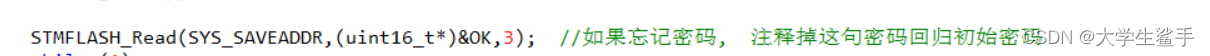 这是我程序中的初始密码, 因为密码是存储到flash的, 所以修改来修改去会忘记之前的密码,如果你忘记了之前的密码可以通过蓝牙修改, 或者注释掉下句代码。