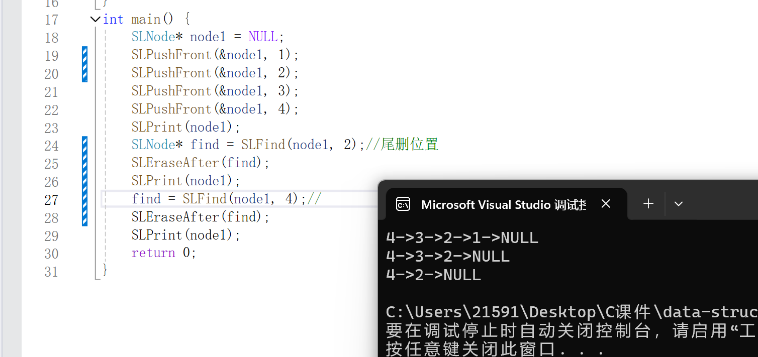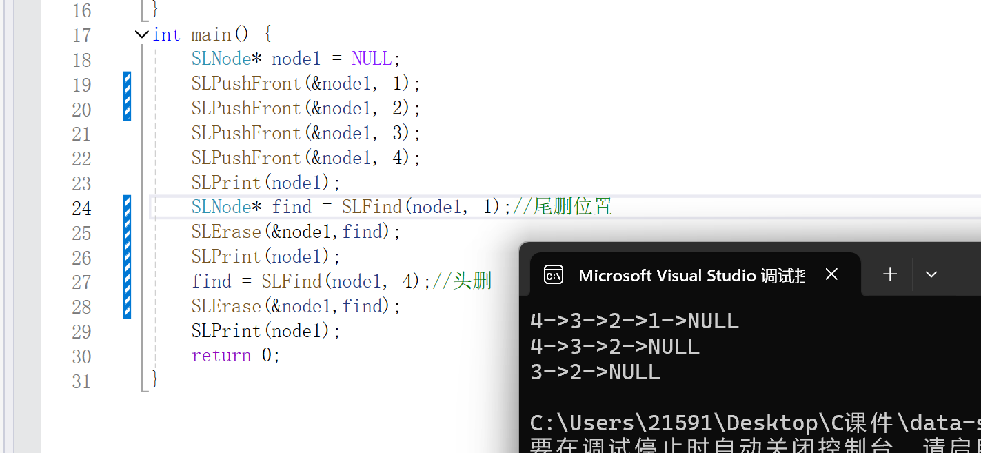 //删除pos结点 void SLErase(SLNode** pphead, SLNode* pos) { assert(*pphead && pphead && pos); if (*pphead == pos) {//处理头删的情况 SLPopFront(pphead); } else { SLNode* pcur = *pphead; while (pcur->next!= pos) { pcur = pcur->next; } pcur->next = pos->next; free(pos); pos = NULL; } }