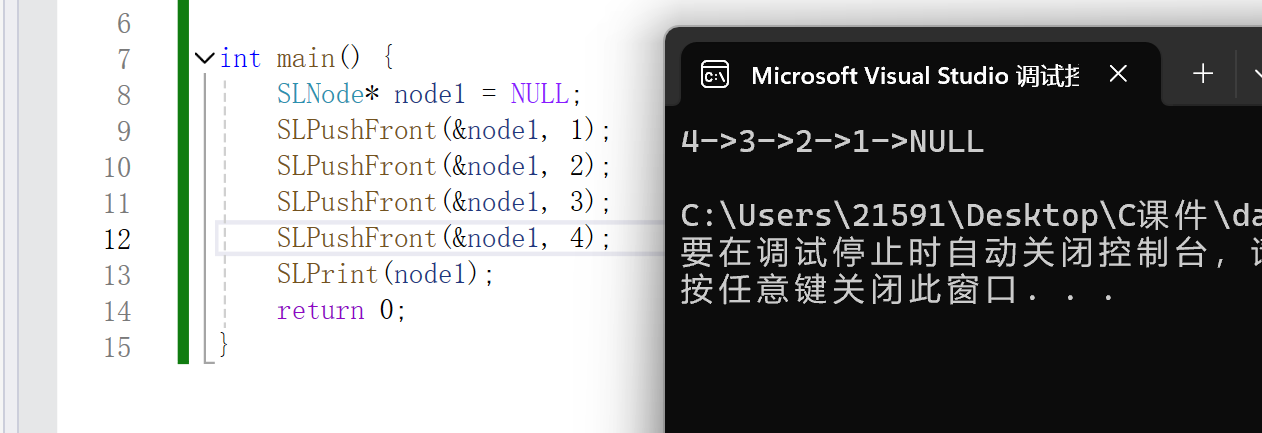 //头部插入 void SLPushFront(SLNode** pphead, SLDataType x) { assert(pphead); SLNode* node = SLBuyNode(x); //这里需要处理头结点为空的情况吗?不需要,因为没有涉及到解引用其元素 node->next = *pphead; *pphead = node; }