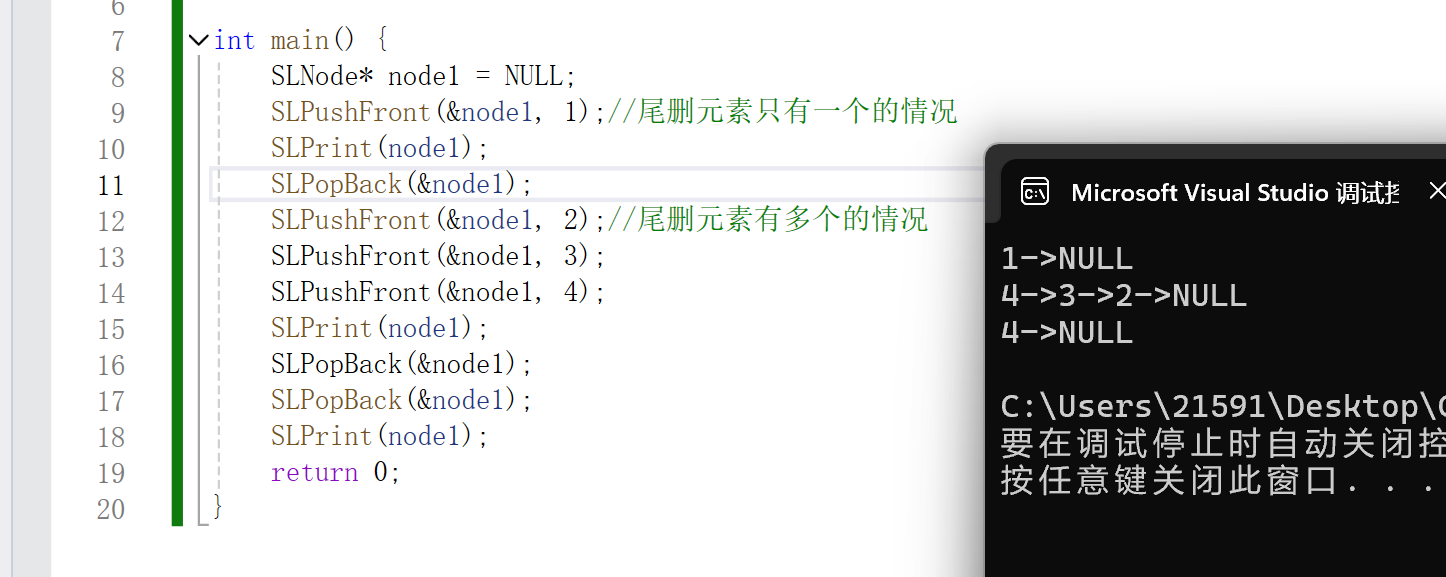 //尾部删除 void SLPopBack(SLNode** pphead) { assert(*pphead && pphead);// if (!(*pphead)->next) {//处理只有一个元素的情况 free(*pphead); *pphead = NULL; } else { SLNode* prev = NULL; SLNode* pcur = *pphead; while (pcur->next) {//找到尾结点前一个结点 prev = pcur; pcur = pcur->next; } free(pcur);//将尾结点释放 pcur = NULL; prev->next = NULL;//将尾结点的前一个结点的next元素置为NULL } }