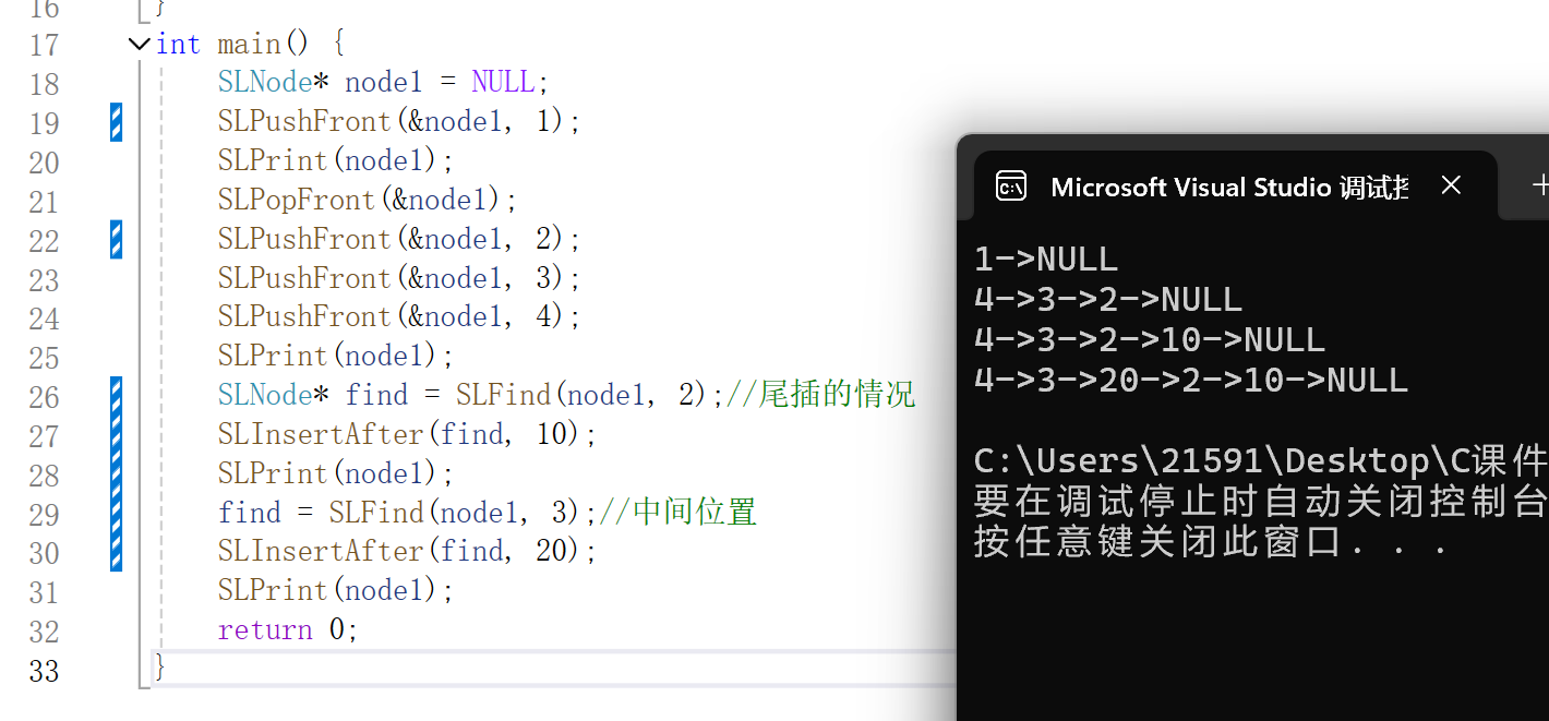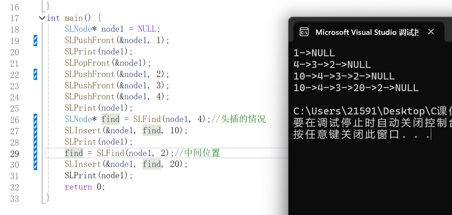 //在指定位置之前插入数据 void SLInsert(SLNode** pphead, SLNode* pos, SLDataType x) { assert(pphead && pos && *pphead);//pos和pphead不能为空,以及pphead指向空间不能为空 if (*pphead == pos) {//处理头插的情况 SLPushFront(pphead,x); } else { SLNode* node = SLBuyNode(x); SLNode* pcur = *pphead; while (pcur->next != pos) {//找到pos前一个结点 pcur = pcur->next; } node->next = pcur->next; pcur->next = node; } }