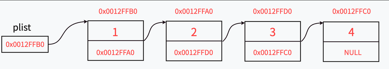 链表的每个结点有两个部分,分别是数据和指向下个结点的指针,每个链表的最后一个结点的下一个结点为NULL(不能对NULL解引用)。