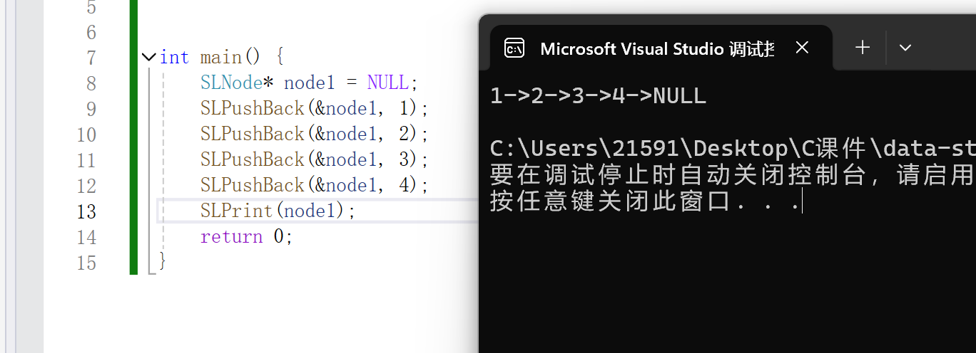 //链表的打印操作 void SLPrint(SLNode* phead) { assert(phead);//不能传入空指针 SLNode* pcur = phead; //pointer cursor:指针光标,不让头结点丢失(虽然不会改变头结点的指向) while (pcur) {//等同于pcur!=NULL printf("%d->", pcur->data);//打印此结点的数据 pcur = pcur->next;//使pcur指向下一个结点 } printf("NULL\n"); }