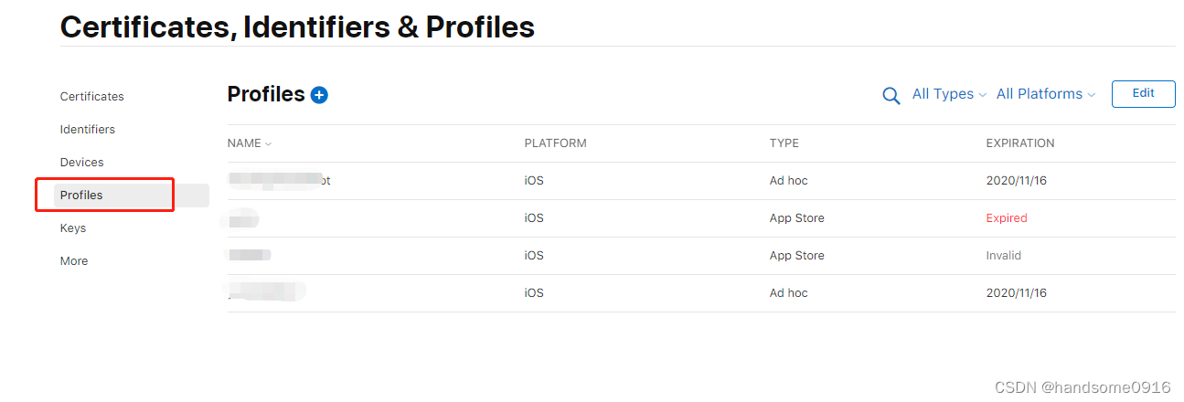 创建profile的时候,可以选择ad hoc类型或者app store类型。