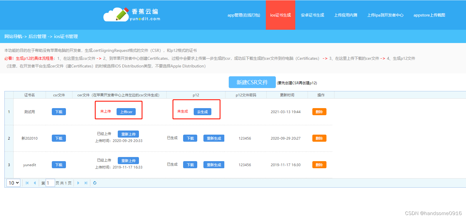 1、进入上面的在线工具,进入创建ios证书的界面,创建csr文件: