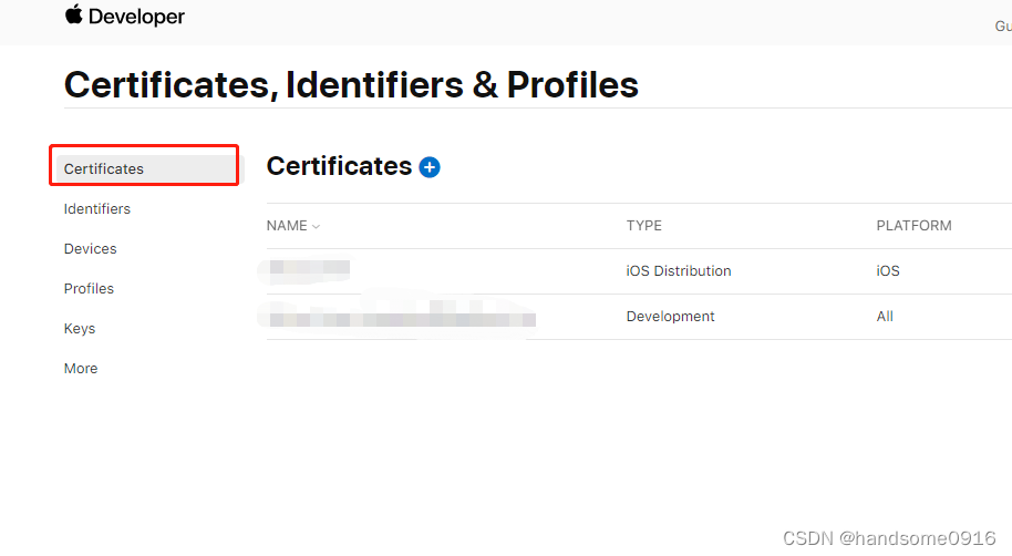 2、进入苹果开发者中心,找下如下的界面,电脑蓝色加号开始创建cer格式的ios证书: