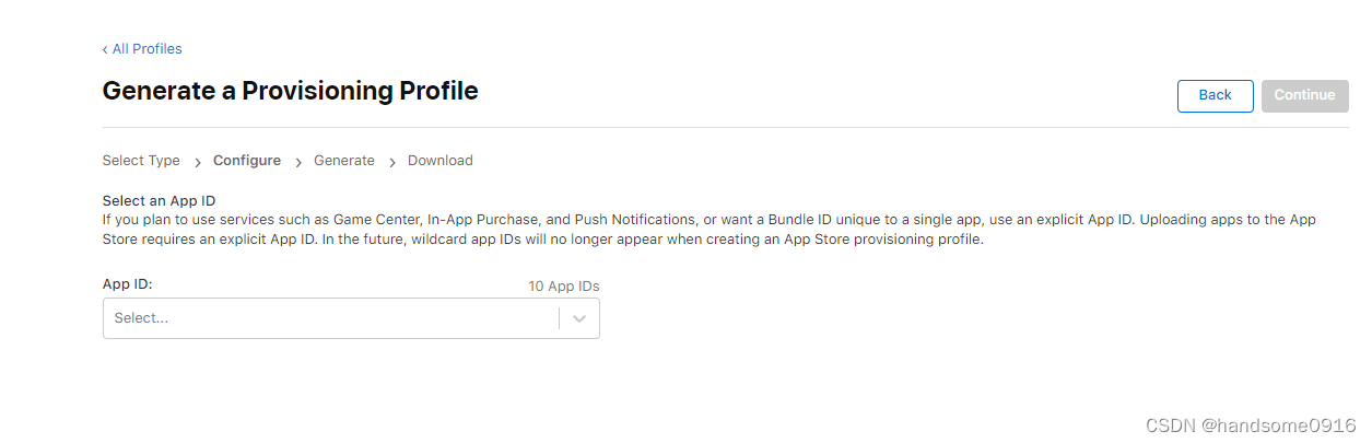 上图的界面是appId的管理页面,这个appId是跟hbuilderx里填写的appId(包名)对应的,比如uni.UNI3EB0xxxxxx这种格式。假如还没有创建appId,要先创建appId,因为创建profile文件的时候需要绑定appId.