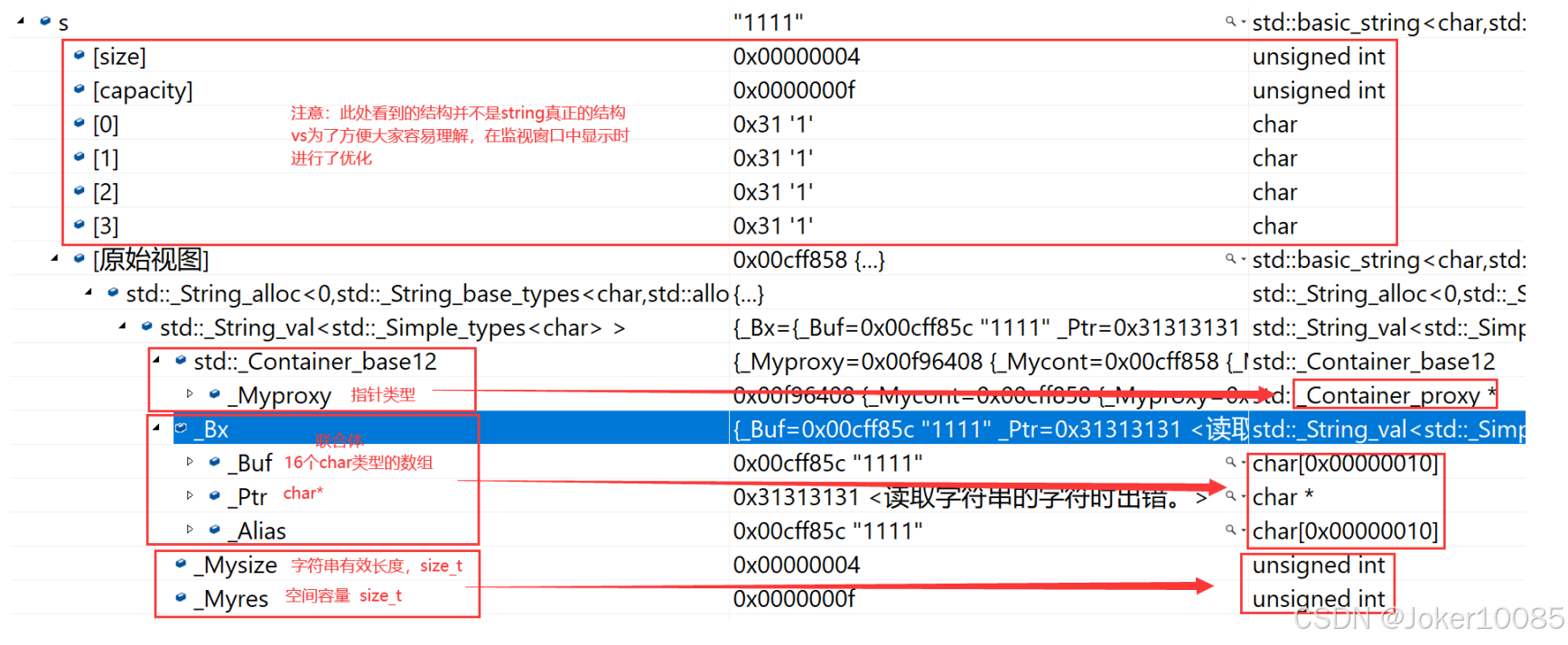 string总共占28个字节,内部结构稍微复杂一点,先是有一个联合体,联合体用来定义string中字 符串的存储空间: 当字符串长度小于16时,使用内部固定的字符数组来存放