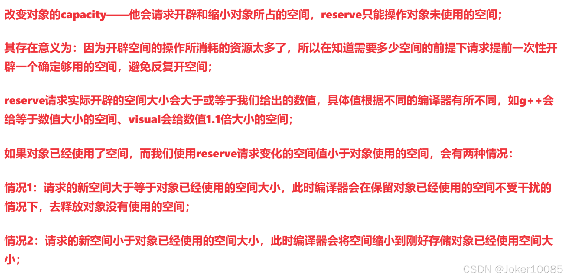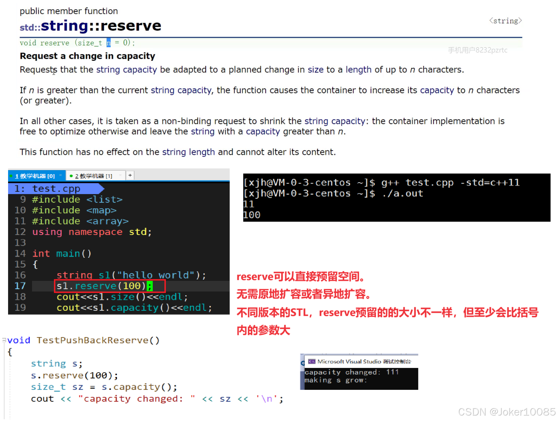 4. reserve(size_t res_arg=0):为string预留空间,不改变有效元素个数,当reserve的参数小于 string的底层空间总大小时,reserver不会改变容量大小