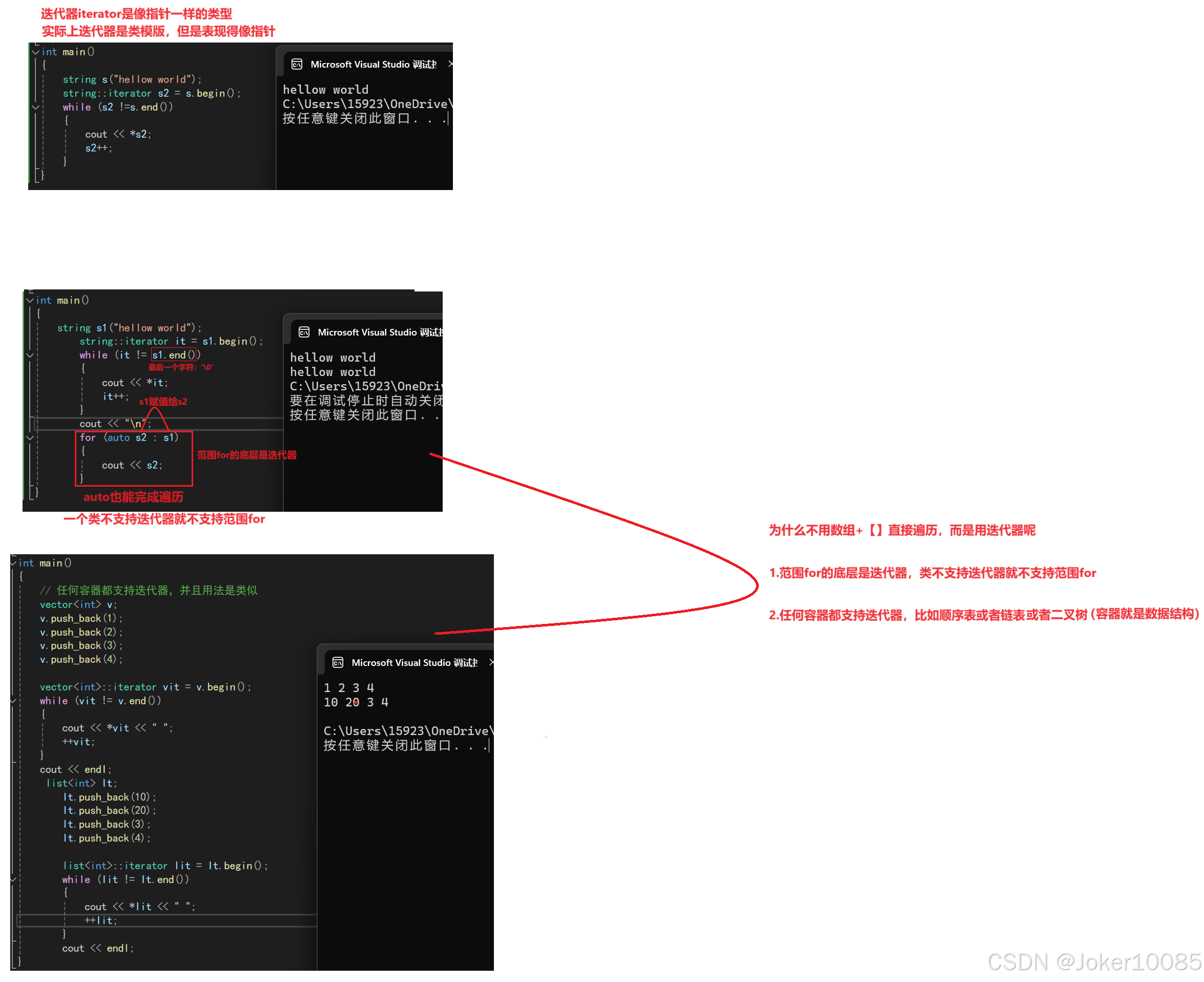 #include using namespace std; #include int main() { string s1("abcdef"); //访问方法:下标访问法 cout << s1[0] << endl; cout << s1[3] << endl; s1[0] = 'h'; //1、下标遍历法 cout << "下标遍历法:"; for (int i = 0; i < s1.size(); i++) { cout << s1[i] << " "; } cout << endl; //2、迭代器法(正向) cout << "迭代器法(正向):"; string::iterator it = s1.begin(); for (; it != s1.end(); it++) { cout << *it << " "; } cout << endl; //3、迭代器(反向) cout << "迭代器(反向):"; string::reverse_iterator rit = s1.rbegin(); while (rit != s1.rend()) { cout << *rit << " "; rit++; } cout << endl; //范围for法 cout << "范围for法:"; for (auto e : s1) { cout << e << " "; } cout << endl; return 0; }
