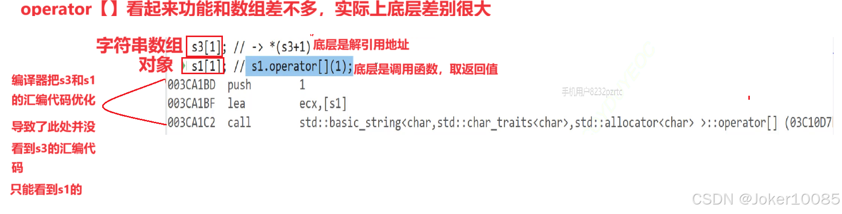 #include using namespace std; #include int main() { string s1("hello "); string s2("world"); //operator+ 涉及深层拷贝,不建议多用 cout << "operator+后:"; cout << operator+(s1, s2) << endl; //operator>> 输入运算符重载 cout << "operator>>:"; string s3; operator>>(cin,s3); cout << s3 << endl; //operator<< 输出运算符重载 cout << "operator<<:"; operator<<(cout, s1) << endl; //getline 获取一行字符串 cout << "getline:"; string s4; getline(cin, s4); //这个在这个程序中测不出来,需要单独测试 cout << s4 << endl; //relational operators 比较大小 //这个函数库中有各种各样的比较函数(==、>、<......),函数类型为bool,感兴趣的可以自己探索一下 return 0; }