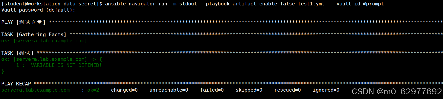我们在编写playbook的时候,通常会有一些敏感的数据,比如用户密码等,不想被别人查看,遇到这样的问题我们可以使用变量来代替用户密码,然后通过一个文件来储存这些变量,最后将这个文件进行加密